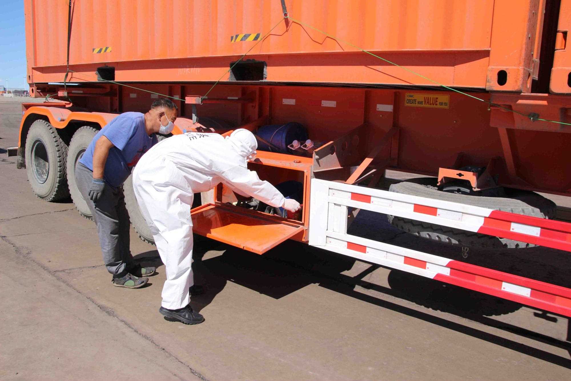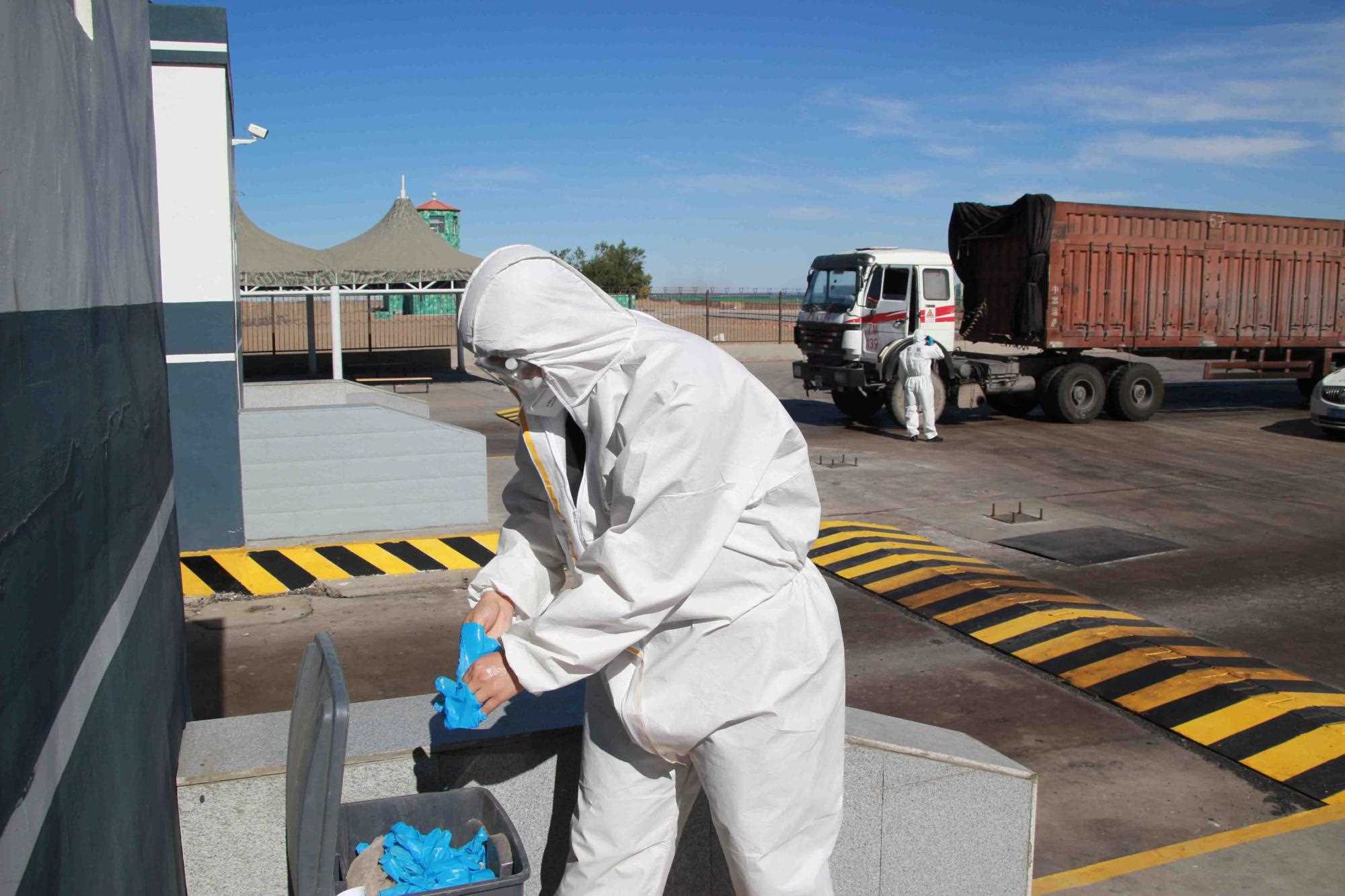 近期策克口岸的溫度持續(xù)增加至30攝氏度以上,而在通行的重型卡車,溫度還要更高,下午15點溫度計地表溫度測量最高可達(dá)40攝氏度。這無疑讓的查驗工作更為繁重。更重要的是,由于疫情影響每名民警在查驗期間都要穿上防護服,在高溫下,由于防護服是密閉的,防護服里仿佛成了蒸箱,用不了十分鐘,民警就會汗流浹背,防護服黏在身上又粘又癢,一班勤務(wù)近2個小時,必須要等過了勤務(wù)才能休息,而民警還要完成車體的查驗工作,包括工具箱、馬槽等處,絲毫不敢馬虎。
