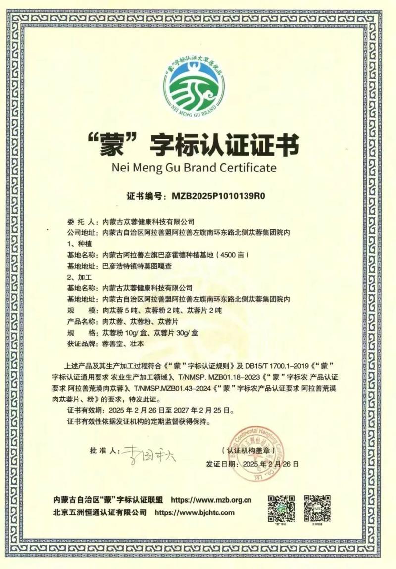 內(nèi)蒙古蓯蓉健康科技有限公司隸屬內(nèi)蒙古阿拉善蓯蓉集團(tuán)有限責(zé)任公司,主要負(fù)責(zé)肉蓯蓉種植基地建設(shè),以及肉蓯蓉食藥同源產(chǎn)品的生產(chǎn)與銷售。目前,公司已建成6萬畝高標(biāo)準(zhǔn)梭梭—肉蓯蓉高產(chǎn)穩(wěn)產(chǎn)示范基地,并獲評(píng)國(guó)家林下經(jīng)濟(jì)示范基地稱號(hào)。公司產(chǎn)品相繼通過有機(jī)產(chǎn)品認(rèn)證、中國(guó)森林認(rèn)證、生態(tài)原產(chǎn)地保護(hù)產(chǎn)品認(rèn)證、道地藥材認(rèn)證和7S道地保真管理體系認(rèn)證,全方位保障產(chǎn)品的生態(tài)有機(jī)特性與全程可追溯性。