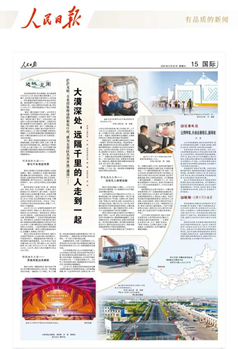 8月22日,《人民日報》國際版“邊城見聞”專欄整版聚焦阿拉善盟策克口岸,以小故事小切口,見證阿拉善盟與周邊經(jīng)貿(mào)往來、人文交流的生動實踐,展示了阿拉善盟高水平對外開放取得的豐碩成果,唱響了一曲親誠惠容行大道、命運與共開新篇的贊歌。全文如下: