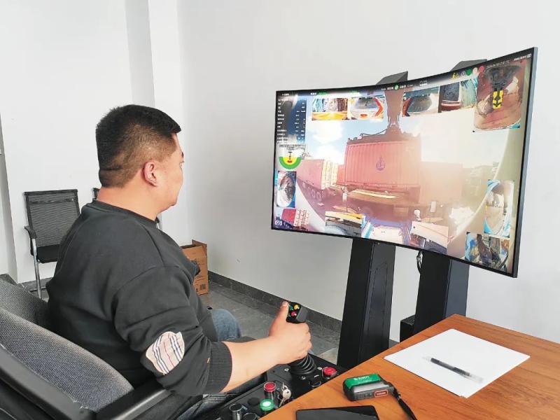 策克口岸工作人員操縱遙控駕駛裝置將集裝箱裝上卡車。田亮攝