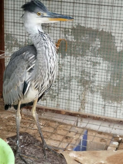 經(jīng)有經(jīng)驗的民警辨認,這是一只蒼鷺幼鳥。這只鳥身高約70公分,長長的尖嘴,身著灰色體羽,頭戴深灰色羽冠,兩條大長腿格外顯眼,白色的前頸縱向排列著黑灰色條紋。民警聯(lián)系獸醫(yī)為其做了體檢,經(jīng)檢查,這只鳥并無傷病,可能是由于剛出窩飛行能力不強、捕食能力不足,造成體力虛弱。民警買來小魚,只見這只鳥狼吞虎咽享用起來,不久便精神十足,開始啄民警??吹剿w力開始恢復(fù),民警懸著的心也就放下了。民警計劃選擇合適時間和地方將其放飛。