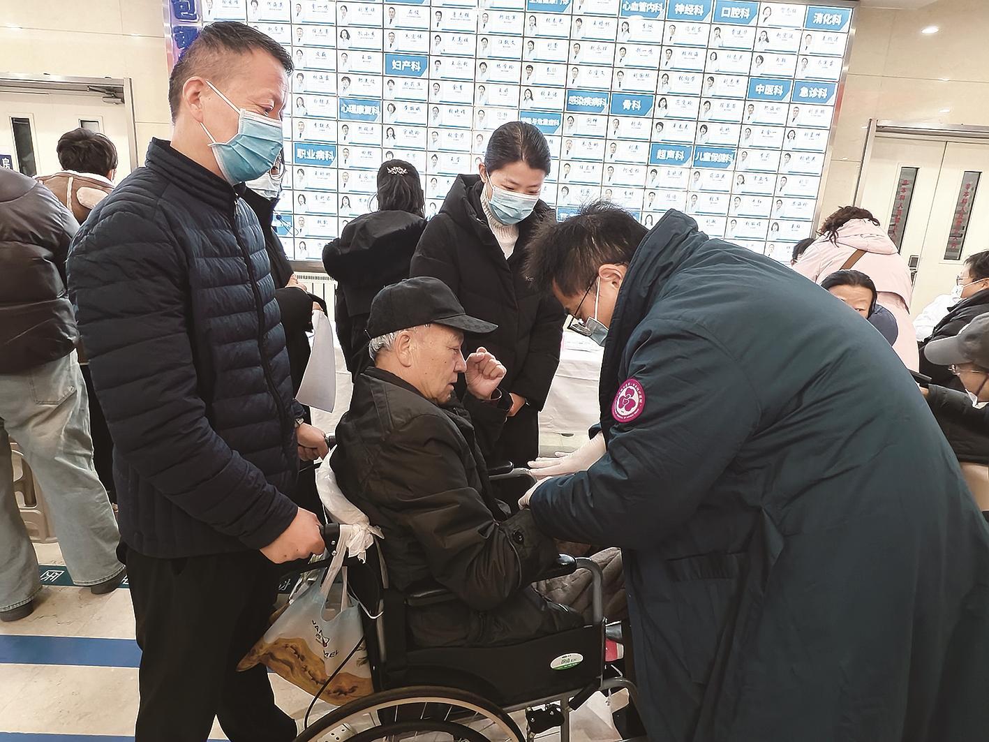 當(dāng)日上午9時(shí)許,包鋼三醫(yī)院門診大廳已經(jīng)是人頭攢動(dòng)。大廳里的“包頭市‘防殘減殘助殘暖冬行動(dòng)’篩查服務(wù)”指示牌格外醒目,抽血、CT、眼科、口腔等專設(shè)服務(wù)窗口前有許多殘疾人朋友在排隊(duì)等候,醫(yī)護(hù)人員引導(dǎo)殘疾人朋友接受檢查,來自北京的專家正在為一位坐在輪椅上的肢殘人士進(jìn)行下肢功能檢查,手法專業(yè)而細(xì)致。
