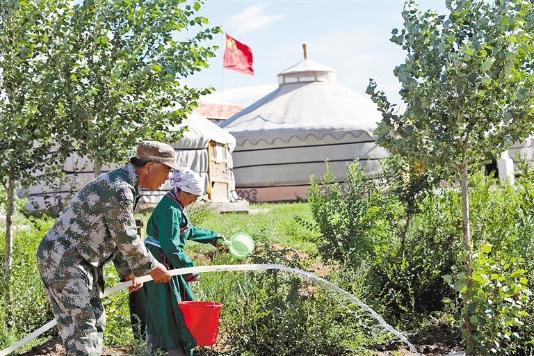 夏日清晨一大早,太陽才露頭,位于中蒙邊境的阿巴嘎旗巴彥圖嘎蘇木巴彥圖呼木嘎查錫林老兵村主任張進(jìn)祥,正在與老鄰居蘇都斯琴往車上搬運(yùn)床架子和厚實(shí)的床墊。不僅如此,不久前,已經(jīng)搬遷到外地居住的貧困戶明干其其格家要通網(wǎng)電,這一惠民之舉對(duì)于周邊的牧民們來說可是盼望已久的大好事,張進(jìn)祥不僅一直幫其照看房子,還東奔西走地幫忙立電線桿、拉線、培土。張進(jìn)祥的妻子和兩個(gè)內(nèi)弟都是當(dāng)?shù)卮緲闵屏嫉拿晒抛迦耍缇桶炎约旱难?、情感融入到了這片深愛的草原上。