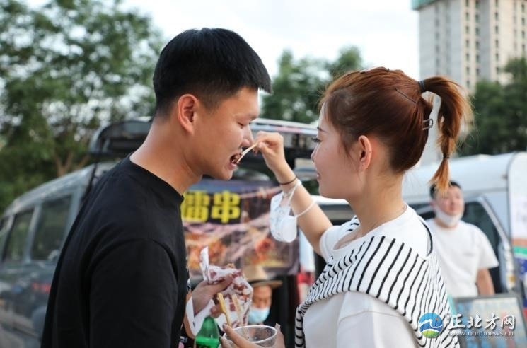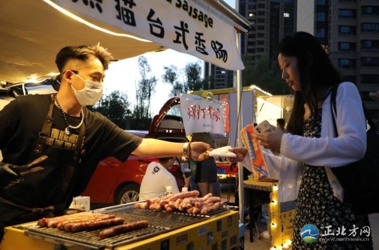 人間煙火氣,最撫凡人心。雖然已是21時(shí)許,但是后備廂集市依然人頭攢動(dòng),熱鬧非凡,叫賣(mài)聲不絕于耳。一家烤腸攤位前,攤主郭浩楠一邊招呼食客,一邊拿著夾子不緊不慢地翻動(dòng)著烤架上的烤腸,烤好后拿竹簽一穿,伴著滋滋作響的聲音,紅光透亮的烤腸瞬間香氣四溢。“已經(jīng)參加了好幾場(chǎng)了,一晚上能售出近百根烤腸,不過(guò)我的初衷不是為了賺錢(qián),就是想把自己鐘情的美食分享給大家。”郭浩楠說(shuō)。