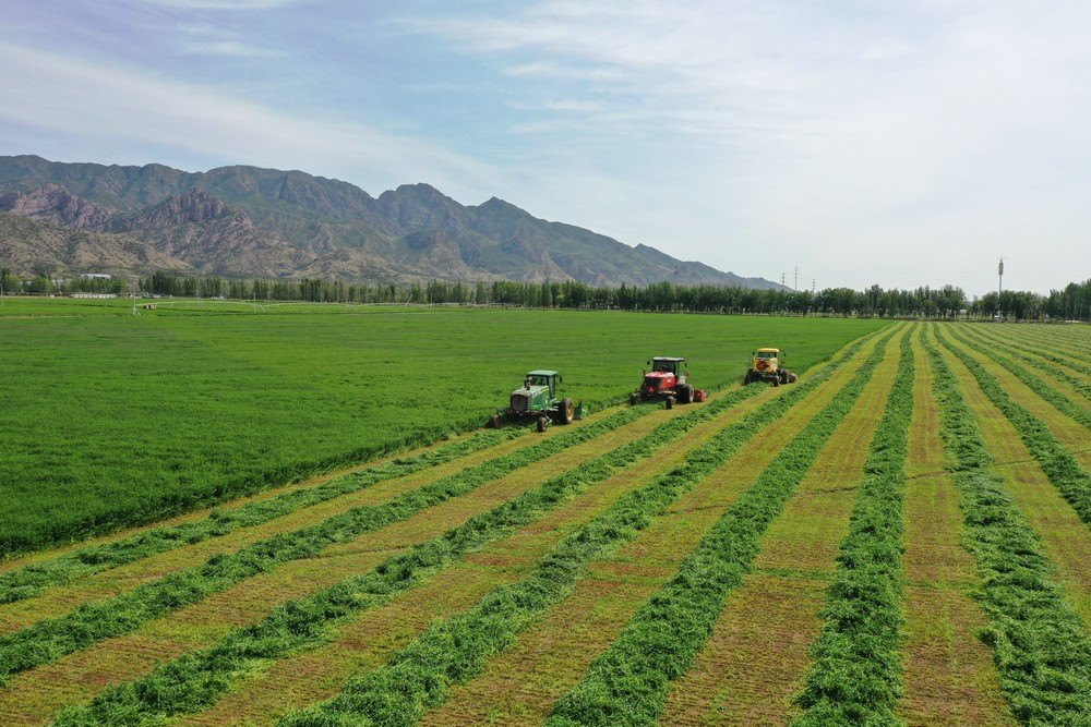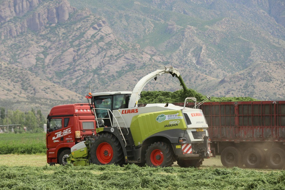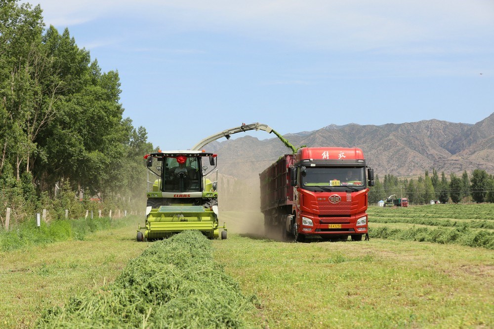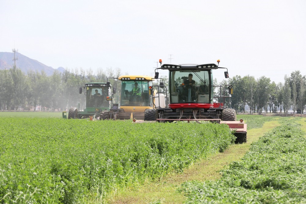 紫花苜蓿是多年生草本植物,因其產(chǎn)量高、生長周期短、再生能力強(qiáng),是優(yōu)質(zhì)的高蛋白牧草。當(dāng)天,收割令一下,3臺(tái)大型收割機(jī)械同時(shí)開動(dòng),如同巨輪駛?cè)刖G色海洋,場面壯觀。割下的紫花苜蓿就地晾曬,待苜蓿中水分含量下降后,再進(jìn)行粉碎、裹包,然后進(jìn)行貯存,提供給牧場作為青貯飼料。