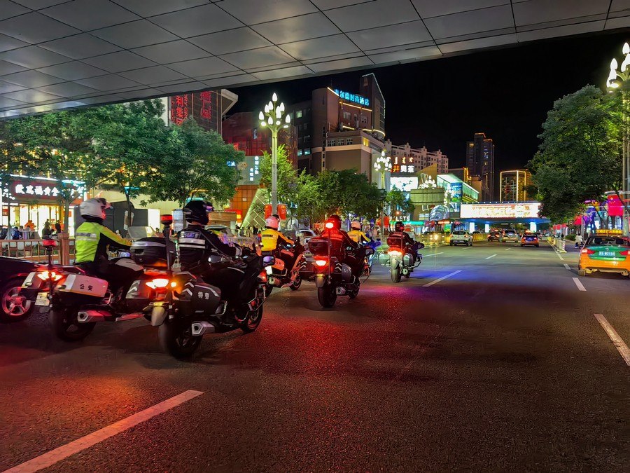 中秋、國(guó)慶兩節(jié)期間,呼和浩特市公安局反恐怖和特巡警支隊(duì)?wèi)?zhàn)鷹突擊隊(duì)與交警支隊(duì)停放管理大隊(duì)鐵騎中隊(duì),聯(lián)合開展巡邏防控工作,并組成了一支騎警處突機(jī)動(dòng)隊(duì),成了呼和浩特大街小巷一道亮麗的風(fēng)景線。圖為中秋節(jié)之夜,這支機(jī)動(dòng)隊(duì)開展聯(lián)合巡邏,守護(hù)青城百姓平安過(guò)節(jié)。 王鑫 攝影報(bào)道