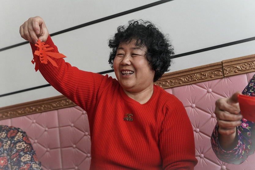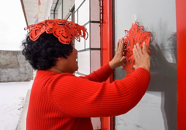 土默特剪紙非遺傳承人李還秀正和姐妹們?cè)诳活^上剪窗花