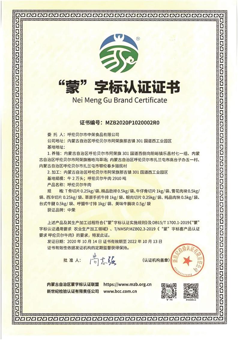 呼倫貝爾市中榮食品有限公司“蒙”字標(biāo)認(rèn)證證書