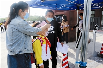 “等了這么久,終于可以和同學(xué)們說句:早上好?!?月2日,早上7點(diǎn)剛過,通遼新城第一中學(xué)小學(xué)部二年一班的班主任崔老師早早的在校門口,迎接班里的小朋友們。記者在校門口看到,此時(shí),小學(xué)部二、三年級(jí)的小朋友已經(jīng)陸續(xù)入校了,顯然,“萌娃”們已經(jīng)被校門口的層層關(guān)卡震撼到了,幸好,在眾多老師的幫助和指引下順利進(jìn)入了校門。進(jìn)入了校門后,還有一道重要關(guān)卡,測(cè)量體溫,習(xí)慣了伸出手臂來測(cè)量體溫的“萌娃”們,對(duì)著紅外線測(cè)溫儀卻不知所措了,有的對(duì)著測(cè)溫儀伸出了手臂、有的對(duì)著測(cè)溫儀行禮,著實(shí)“萌”翻了現(xiàn)場(chǎng)所有人?!按蘩蠋煟覀兌枷肽懔??!币姷綆孜恍∨笥岩獪惖礁皟?,崔老師立刻提醒同學(xué)們:我也很想念你們,但是我們要保持“一米”的距離,快去教室吧!小朋友們被“殘忍”拒絕,很是失落。