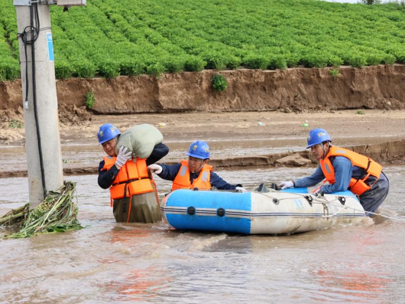 后旗公司運維人員用皮劃艇運送沙袋,加固10千伏花燈線125號桿。(攝影:楊雨寧)