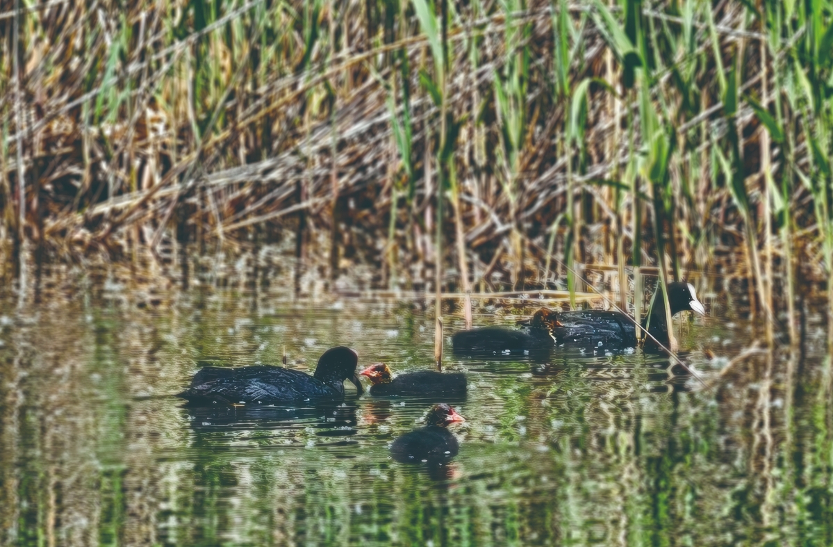在不遠(yuǎn)處的水域,白骨頂雞一家成為眾人關(guān)注的焦點(diǎn)。幾只剛剛出窩的幼鳥,圓滾滾、毛茸茸的,正好奇地在水中游動(dòng),動(dòng)作略顯笨拙,還不時(shí)發(fā)出稚嫩的叫聲。成年白骨頂雞則忙著覓食,它們一頭扎進(jìn)水里,再浮出水面時(shí),嘴里已叼著小魚小蝦,隨后快速游向幼鳥喂食。幼鳥們爭(zhēng)搶食物的場(chǎng)景,充滿了趣味。