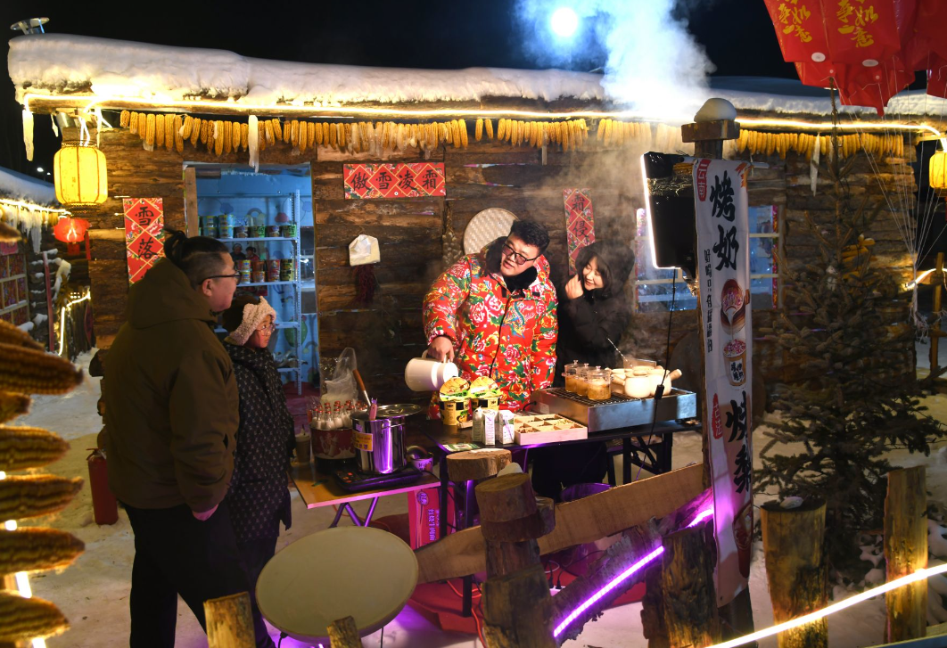 踏入雪鄉(xiāng)板塊,50個復刻北方傳統(tǒng)風貌的院落集群映入眼簾,木柵欄上垂掛的紅燈籠與蓬松雪層相映成趣,屋檐下懸垂的雪舌、雪簾勾勒出童話般的輪廓。每個院落都藏著專屬打卡場景,推門而入可見家庭場景,窗外是皚皚白雪,屋內(nèi)飄著燒烤、火鍋和奶茶的醇厚香氣,瞬間驅(qū)散冬日寒意。游客穿梭其間,鈴鐺輕響,為這份雪鄉(xiāng)煙火氣增添了濃郁的民族風情。