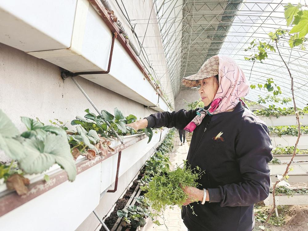 走進草莓大棚內,濃濃的暖意撲面而來。抬眼望去,離地一米多的種植架上種滿了生機勃勃、長勢喜人的草莓;穿梭在種植架間,一顆顆鮮紅欲滴、圓潤飽滿的草莓宛如璀璨的紅寶石,從綠葉間“探出頭”來,高高地懸掛在空中,散發(fā)著誘人的清香。種植戶牛尚海正在察看采用立體栽培技術的草莓長勢情況?!斑@是一種三維立體種植方式,能夠充分利用空間和光照,大幅度提高生產(chǎn)效率。以前一畝地最多種8000株,現(xiàn)在能種2.4萬株,產(chǎn)量提高了3倍,而且草莓個頭更均勻,賣相更好?!迸I泻8嬖V記者,這種種植方式不僅省工、省力,還降低了勞動強度,摘草莓也不用彎腰了。此外,這種種植模式比傳統(tǒng)種植模式每畝節(jié)水50%。