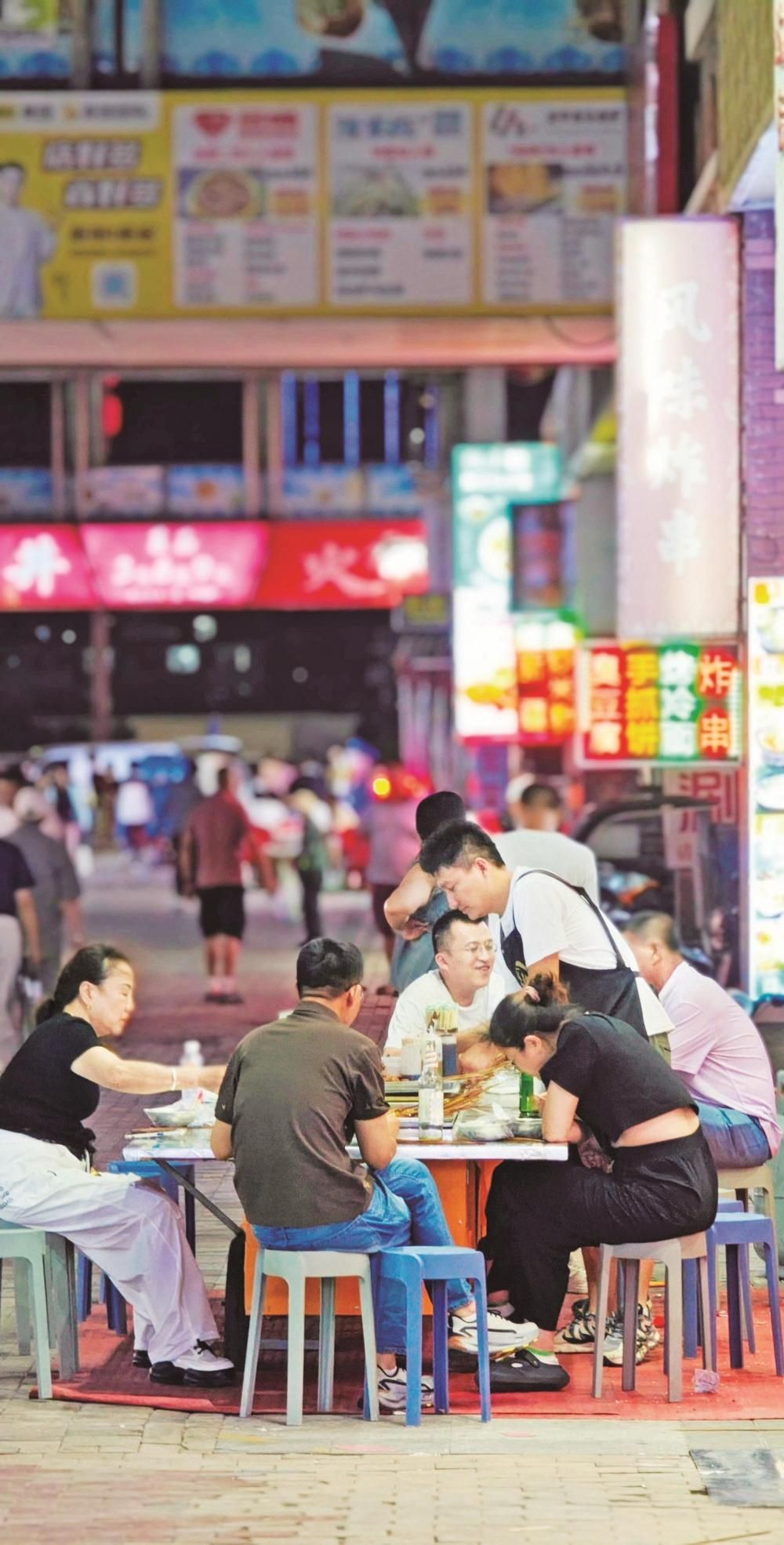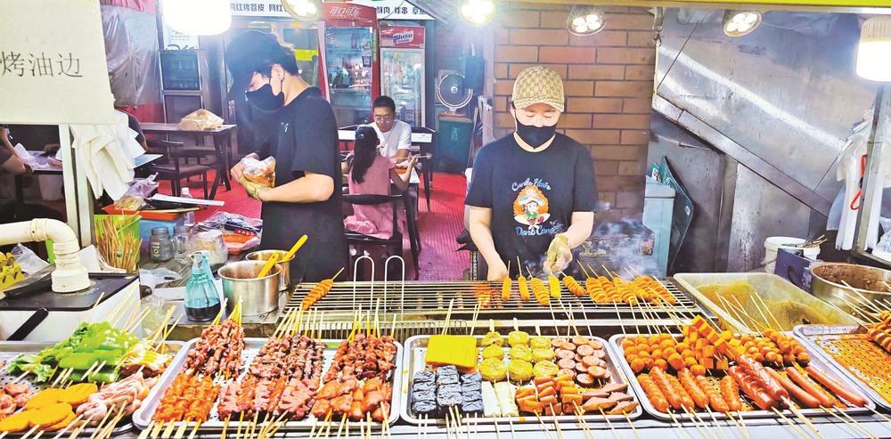 炭火上的羊肉串嗞嗞作響,油脂滴落,迸出金色火花,散發(fā)出誘人的香氣??腿藝谒芰闲∽琅?,手里拿著冰鎮(zhèn)啤酒,碰杯傳出清脆的響聲……這里沒有高檔餐廳的拘謹(jǐn),只有朋友相聚的歡樂和大口吃肉的暢快。大學(xué)生徐瑞虹放暑假后,經(jīng)常和朋友來夜市消暑。“我們幾個沒事就來萬達(dá)金街轉(zhuǎn)一轉(zhuǎn),天太熱了,待在家里也悶,而且夜市里的這些小吃我們都比較喜歡,沒事幾個人喝幾瓶啤酒,聊一聊天,感覺還是很愜意的?!睂τ谀贻p人來說,夜市不僅是美食的聚集地,更是釋放壓力、享受生活的好去處。在這里,他們可以暫時拋開煩惱,盡情享受美食帶來的快樂。