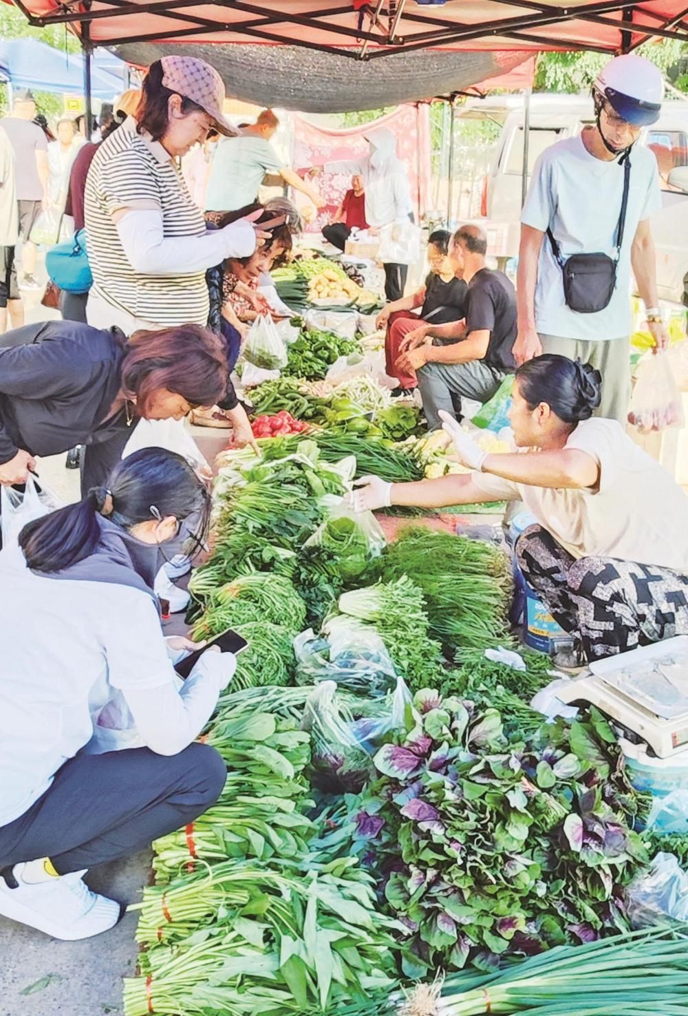夏日的早市里,菜攤攤主牛麗梅就已經(jīng)擺放好新鮮的蔬菜,泡沫箱里的黃瓜頂著嫩黃的花,筐里的西紅柿還帶著露珠,“這些菜都是半夜起來從地里現(xiàn)摘的,你看看這黃瓜頂花帶刺的,多新鮮。我已經(jīng)在這個早市擺了十來年攤了,人們還是很認(rèn)可我家的蔬菜,就是累點(diǎn)也覺得挺高興的?!彼裏崆榈卣泻糁皝碣I菜的市民,過秤、算賬,干脆利落,一看就有著豐富的賣菜經(jīng)驗(yàn)。