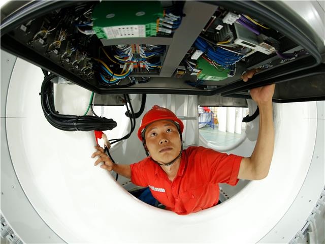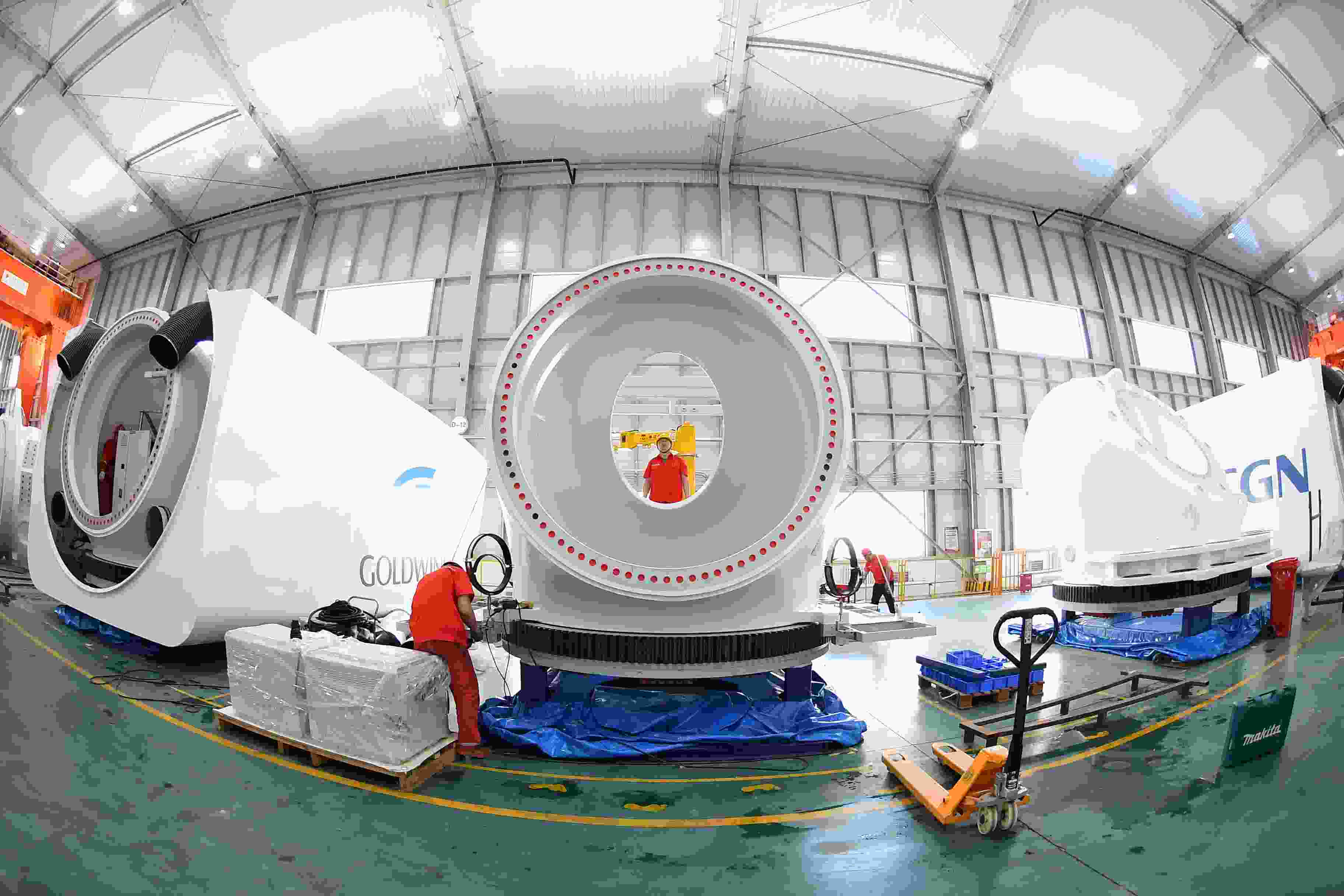 金風科技公司工人在安裝風機主機。金泉攝
