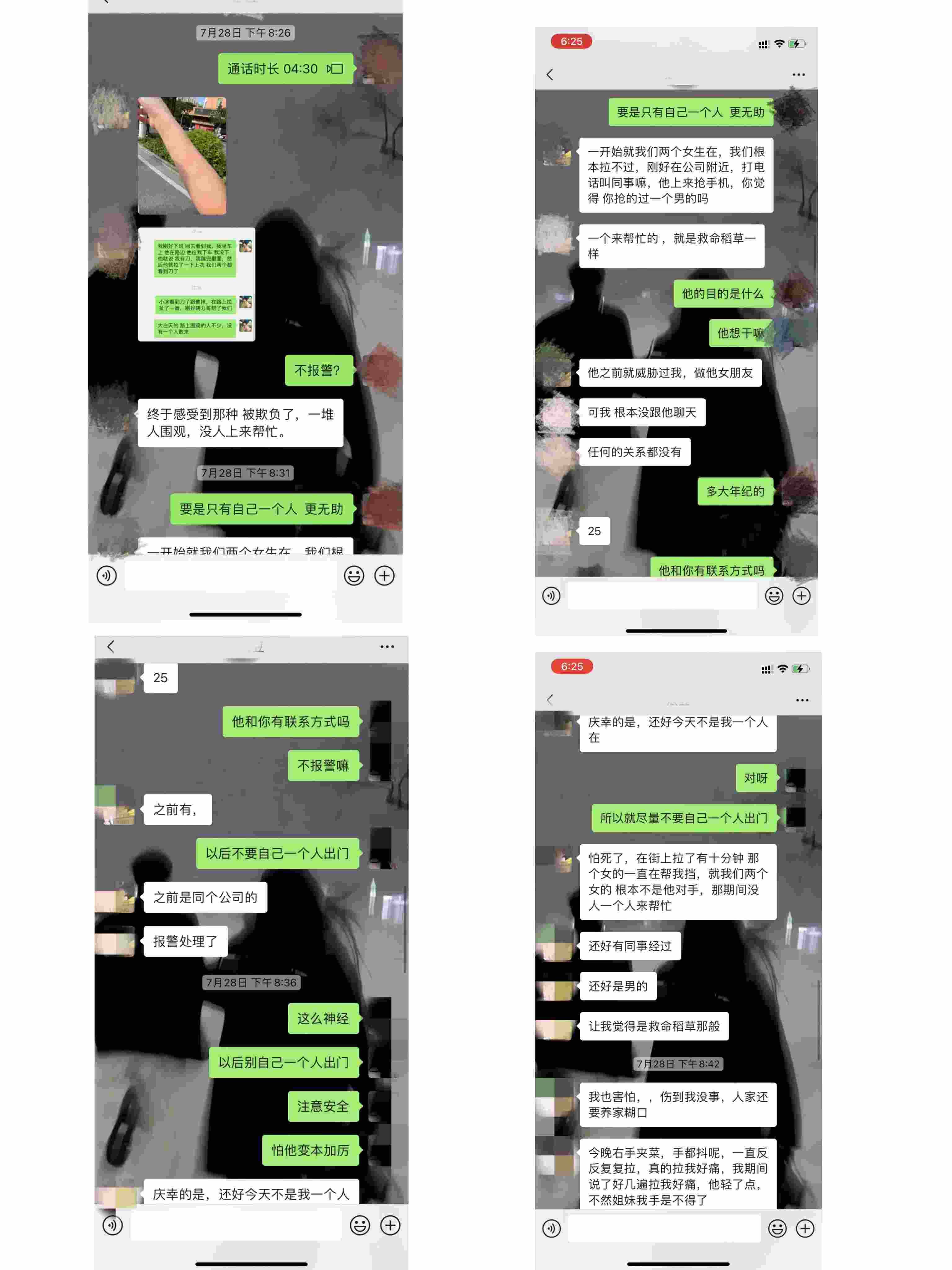 相關(guān)聊天截圖顯示,此次被黃某南威脅后,陳某萍和朋友在微信聊天時(shí)表示,“報(bào)警處理了”。陳某萍還表示,當(dāng)時(shí),黃某南拉她上衣時(shí),她看到了刀,感到非常害怕,幸好有同事出手相助?!八熬屯{過我,做他女朋友??晌腋緵]跟他聊天,任何關(guān)系都沒有?!?/p>