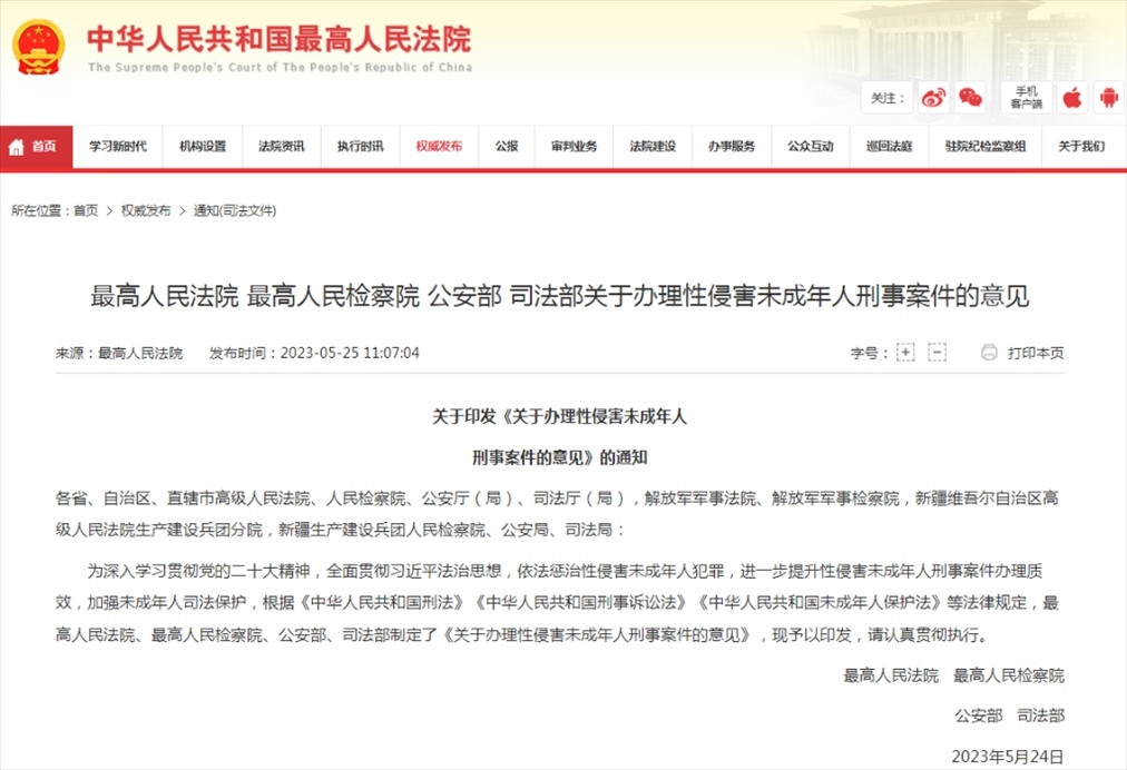 最高人民法院、最高人民檢察院25日聯(lián)合發(fā)布關(guān)于辦理強(qiáng)奸、猥褻未成年人刑事案件適用法律若干問(wèn)題的解釋。最高人民法院、最高人民檢察院、公安部、司法部聯(lián)合發(fā)布關(guān)于辦理性侵害未成年人刑事案件的意見(jiàn)。