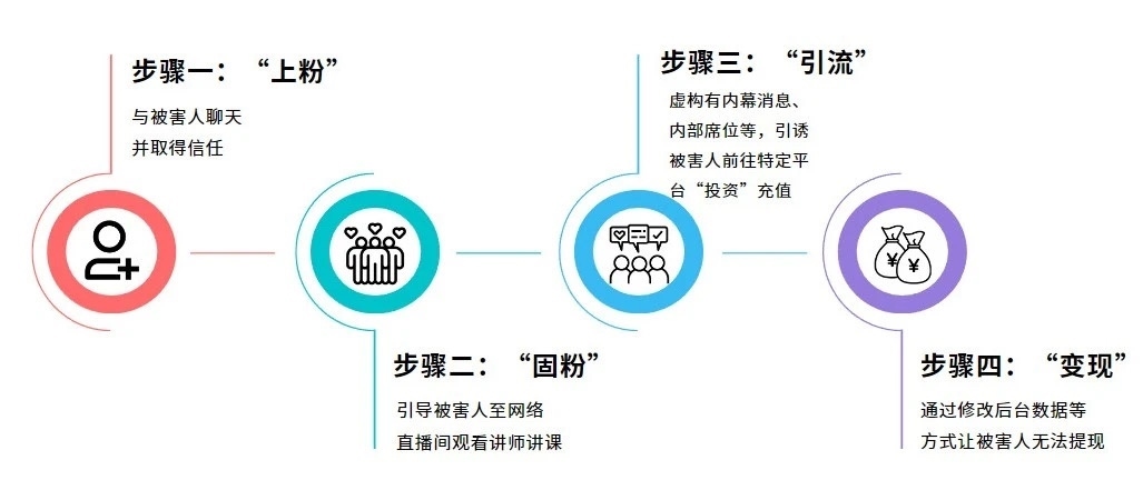 接下來,講師會通過虛構有內幕消息、內部席位等情節(jié),將被害人“引流”至團伙自制的“長盛資本”“瑞達資產”“匯利資產”等平臺“投資”充值,后把握時機,通過修改后臺數據等方式讓被害人無法提現(xiàn),卻成為他們的“變現(xiàn)”時刻。至案發(fā)時,該團伙已詐騙多名被害人,犯罪金額共計人民幣500余萬元。