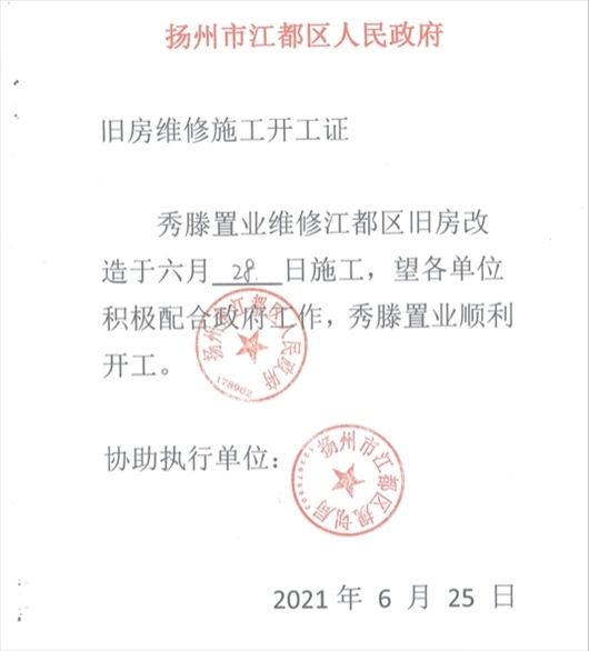 “搞定”西苑社區(qū)后,楊某軍偽造一份《揚州市江都區(qū)人民政府舊房維修施工開工證》,并加蓋“揚州市江都區(qū)人民政府 178962”“揚州市江都區(qū)規(guī)劃局”公章。周女士獲得該證后,立即組織顧先生進(jìn)場施工?!皸钅耻娮屛蚁葔|付材料款和人工費,后面等財政撥款就行。我就安排顧先生7月1日進(jìn)場施工。”