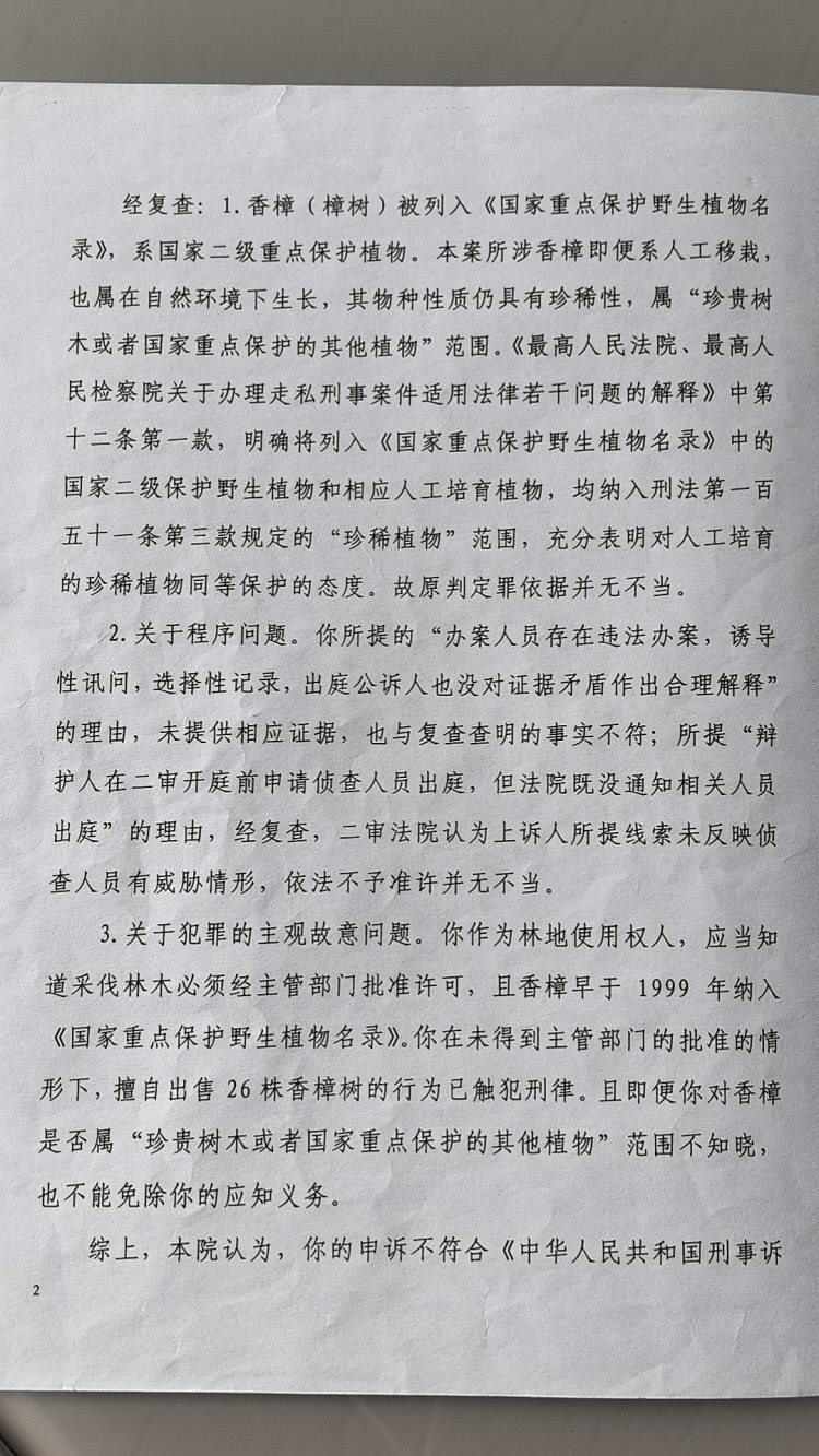 上游新聞?dòng)浾咦⒁獾?,敘永縣法院一審判決中還引用了最高法、最高檢《關(guān)于辦理走私刑事案件適用法律若干問題的解釋》,以“國家禁止、限制出口的珍稀植物,包括相關(guān)名錄中人工培育的植物”為由,認(rèn)定了人工栽植的國家重點(diǎn)保護(hù)物種也應(yīng)予以保護(hù)的結(jié)論。敘永縣法院綜合認(rèn)定,馬萬林等砍伐、售賣的香樟樹屬于國家重點(diǎn)保護(hù)植物,對(duì)辯方提出的“香樟樹不屬于重點(diǎn)保護(hù)野生植物”的辯護(hù)理由不予采納,但在量刑時(shí)予以考慮,酌情減輕了對(duì)兩名被告人的處罰。