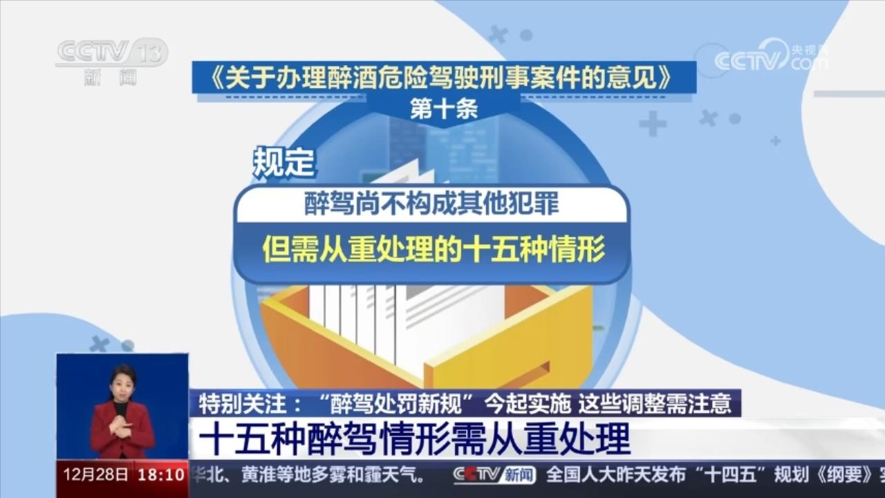 央視網(wǎng)消息:12月28日開始,《關(guān)于辦理醉酒危險駕駛刑事案件的意見》,俗稱“醉駕處罰新規(guī)”正式實施。此前,《意見》由最高人民法院、最高人民檢察院、公安部、司法部聯(lián)合發(fā)布。