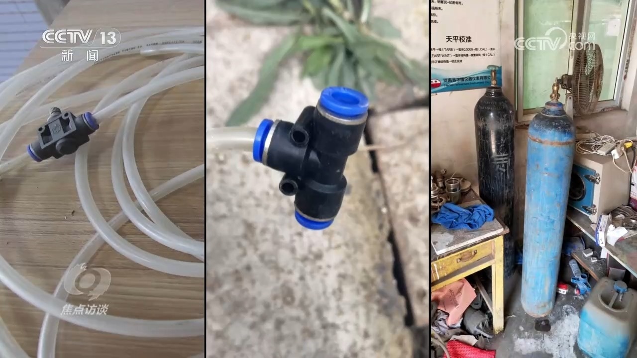 塑料軟管、三通管件、氮?dú)馄?,就是“環(huán)??萍脊尽钡娜藖斫o磚廠安裝的所謂“環(huán)保設(shè)備”,他們把氮?dú)饨尤氩蓸庸芫€,稀釋采樣氣體,從而達(dá)到干擾在線監(jiān)測數(shù)據(jù)的目的。