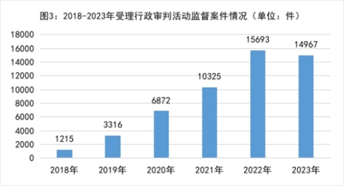 3.行政審判活動(dòng)監(jiān)督更有實(shí)效。2018年以來(lái)受理行政審判活動(dòng)監(jiān)督案件分別是:2018年1215件、2019年3316件、2020年6872件、2021年10325件、2022年15693件,年均增加89.6%。經(jīng)過(guò)連續(xù)五年監(jiān)督,監(jiān)督效果初步體現(xiàn)。2023年共受理14967件,同比下降4.6%。其中,依職權(quán)受理占95.5%;依申請(qǐng)受理占4.5%。針對(duì)超期立案、超期審理、違反規(guī)定送達(dá)法律文書等審判程序違法問(wèn)題,向法院提出檢察建議13491件,同比下降6.8%。