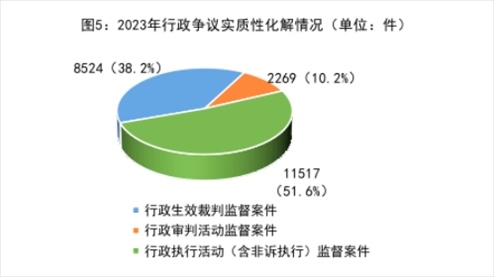 5.行政爭(zhēng)議實(shí)質(zhì)性化解持續(xù)深化做實(shí)。針對(duì)司法實(shí)踐中一些行政案件程序已結(jié)但訟爭(zhēng)未解的“程序空轉(zhuǎn)”“案結(jié)事不了”等問(wèn)題,2023年共促進(jìn)案涉行政爭(zhēng)議實(shí)質(zhì)性化解22310件,同比上升26%。其中,行政生效裁判監(jiān)督案件8524件,占38.2%;行政審判活動(dòng)監(jiān)督案件2269件,占10.2%;行政執(zhí)行活動(dòng)(含非訴執(zhí)行)監(jiān)督案件11517件,占51.6%。