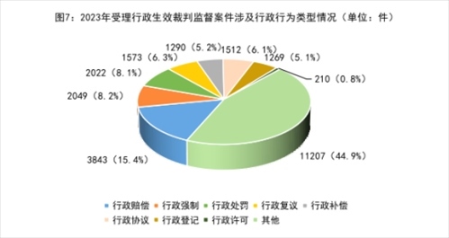 4.案涉行政行為類型中,行政賠償、行政強(qiáng)制、行政處罰等類案件占比較高,行政許可類案件處于低位。行政檢察監(jiān)督案件涉及的行政行為類型較為廣泛,從2023年行政生效裁判監(jiān)督案件情況看,涉及行政賠償類案件3843件、行政強(qiáng)制類案件2049件、行政處罰類案件2022件、行政復(fù)議類案件1573件、行政補(bǔ)償類案件1290件、行政協(xié)議類案件1512件、行政登記類案件1269件,這七類案件約占54.3%。特別指出的是,由于“放管服”改革的深入推進(jìn),近年來(lái)涉行政許可類行政生效裁判監(jiān)督案件始終處于低位,2023年辦理此類案件210件,占比僅為0.8%。