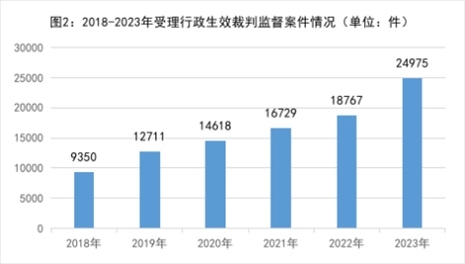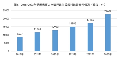 1.依申請(qǐng)監(jiān)督的行政生效裁判監(jiān)督案件數(shù)量逐年上升,反映出人民群眾對(duì)檢察監(jiān)督的更高需求。2018年以來(lái)當(dāng)事人不服法院生效裁判向檢察機(jī)關(guān)申請(qǐng)監(jiān)督的案件分別是:2018年8697件、2019年11643件、2020年12933件、2021年14995件、2022年17186件、2023年22602件,年均增加21%。2023年16個(gè)省級(jí)檢察院受理行政案件數(shù)超過(guò)民事案件。當(dāng)事人對(duì)裁判結(jié)果申請(qǐng)監(jiān)督的同時(shí),很多情況下還對(duì)審判和執(zhí)行程序一并主張?jiān)V求,追求“看得見”的公平正義。