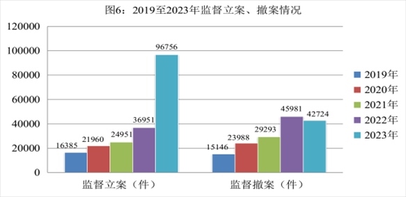 全國檢察機關共監(jiān)督立案96756件,同比上升1.6倍。監(jiān)督立案后起訴29974人,同比上升89.7%。作出生效裁判25693人,同比上升82.7%,其中,判處有期徒刑以上刑罰25259人,判處有期徒刑以上刑罰率98.3%,同比增加0.9個百分點。監(jiān)督撤案42724件,監(jiān)督撤案率100%,同比增加0.1個百分點,呈逐年上升趨勢。