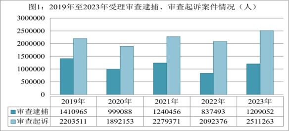 隨著新冠疫情防控轉段,我國經(jīng)濟回升向好,社會活躍度增加,同時,檢察機關與有關部門一道依法從嚴懲處電信網(wǎng)絡詐騙等嚴重影響人民群眾安全感的犯罪,刑事犯罪案件總量增長。2023年,全國檢察機關受理審查逮捕各類犯罪828999件1209052人,同比分別上升49.8%、44.4%。審查后共批準逮捕72.6萬人,同比上升47.1%;受理審查起訴各類犯罪1786635件2511263人,同比分別上升19.7%、20%。審查后決定起訴168.8萬人,同比上升17.3%。
