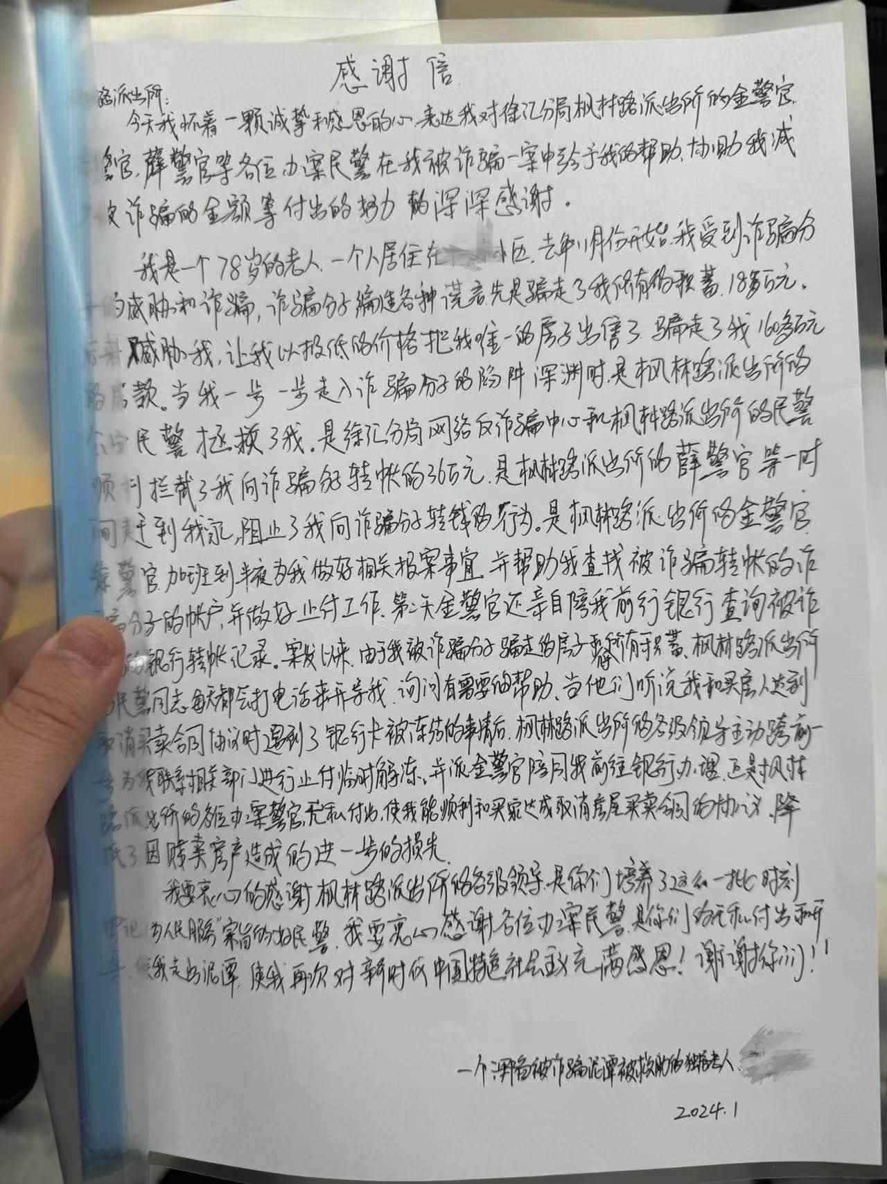 “我要衷心感謝各位辦案民警,是你們的無私付出和開導,使我走出泥潭!”事后,市民劉女士向楓林路派出所民警送來感謝信。