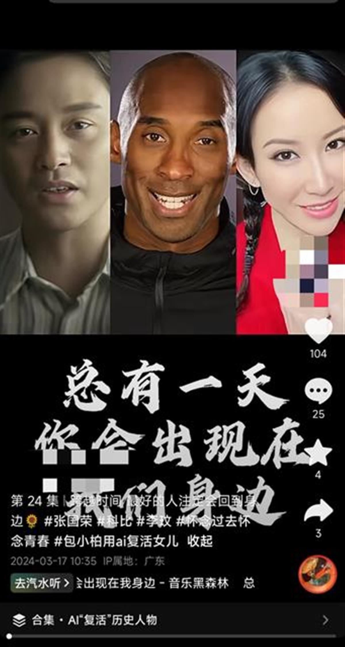 在社交平臺,類似的“AI復活師”賬號仍在活躍。這些賬號通過發(fā)布科比、李玟、張國榮等已逝名人的AI視頻吸引觀眾,并在簡介中聲稱可以通過AI技術(shù)定制數(shù)字人、克隆聲音、修復照片,還能“復活”已逝親人,定制他們的音頻視頻。目前,部分“AI復活師”的視頻已被平臺標注“內(nèi)容疑似AI生成,請謹慎甄別”。