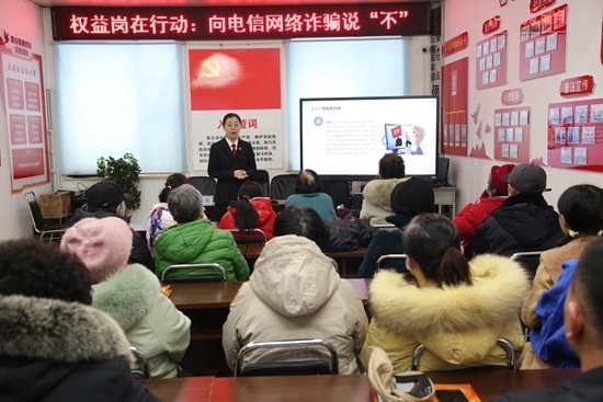 吉林省吉林市船營區(qū)人民法院在向陽街道北安社區(qū)開展“向電信網(wǎng)絡(luò)詐騙說‘不’”普法講座。