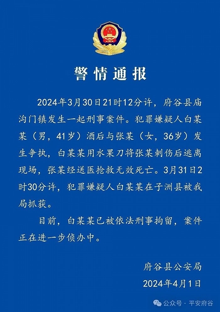 央視網(wǎng)消息:據(jù)陜西府谷縣公安局通報,3月30日21時12分許,府谷縣廟溝門鎮(zhèn)發(fā)生一起刑事案件。犯罪嫌疑人白某某(男,41歲)酒后與張某(女,36歲)發(fā)生爭執(zhí),白某某用水果刀將張某刺傷后逃離現(xiàn)場,張某經(jīng)送醫(yī)搶救無效死亡。3月31日2時30分許,犯罪嫌疑人白某某在子洲縣被府谷縣公安局抓獲。