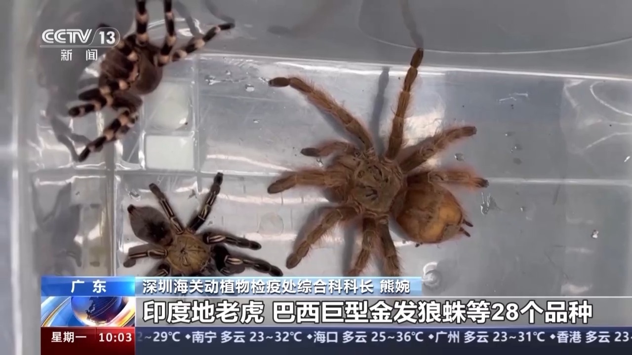 深圳海關(guān)動(dòng)植物檢疫處綜合科科長(zhǎng) 熊婉:查驗(yàn)關(guān)員在對(duì)轉(zhuǎn)運(yùn)快件開(kāi)展監(jiān)管時(shí),發(fā)現(xiàn)一票申報(bào)品名為“相機(jī)三腳架”的快件包裹機(jī)檢圖像異常,不符合相機(jī)三腳架的圖像特征,隨后進(jìn)行了開(kāi)包查驗(yàn)。經(jīng)過(guò)專(zhuān)業(yè)機(jī)構(gòu)鑒定,這批活體蜘蛛是墨西哥金背紅尾蛛、印度地老虎、巨人偽鳴蛛、巴西巨型金發(fā)狼蛛等28個(gè)品種。
