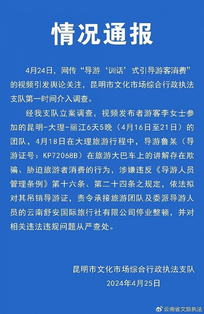 央視網(wǎng)消息:4月25日,昆明市文化市場綜合行政執(zhí)法支隊(duì)通報(bào),4月24日,網(wǎng)傳“導(dǎo)游‘訓(xùn)話’式引導(dǎo)游客消費(fèi)”的視頻引發(fā)輿論關(guān)注,昆明市文化市場綜合行政執(zhí)法支隊(duì)第一時(shí)間介入調(diào)查。經(jīng)支隊(duì)立案調(diào)查,視頻發(fā)布者游客李女士參加的昆明-大理-麗江6天5晚(4月16日至21日)的團(tuán)隊(duì),4月18日在大理旅游行程中,導(dǎo)游魯某在旅游大巴車上的講解存在欺騙、脅迫旅游者消費(fèi)的行為,涉嫌違反《導(dǎo)游人員管理?xiàng)l例》第十六條、第二十四條之規(guī)定,依法擬對其吊銷導(dǎo)游證,責(zé)令承接旅游團(tuán)隊(duì)及委派導(dǎo)游人員的云南舒安國際旅行社有限公司停業(yè)整頓,并對相關(guān)違法違規(guī)問題從嚴(yán)查處。