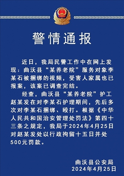 經(jīng)查,曲沃縣“某養(yǎng)老院”護工趙某發(fā)在對李某石護理期間,先后多次對李某石捆綁、毆打。根據(jù)《中華人民共和國治安管理處罰法》第四十三條之規(guī)定,曲沃縣公安局于2024年4月25日對趙某發(fā)處以行政拘留十五日并處500元罰款。
