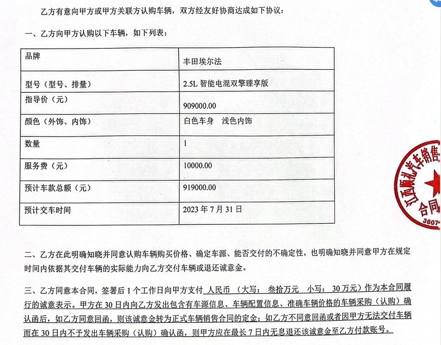 豐田埃爾法汽車,預(yù)計(jì)車款總額91.9萬(wàn)元,其中車輛指導(dǎo)價(jià)90.9萬(wàn)元,服務(wù)費(fèi)1萬(wàn)元,預(yù)計(jì)交車時(shí)間為2023年7月31日。簽訂認(rèn)購(gòu)合同當(dāng)天,任先生支付了30萬(wàn)元誠(chéng)意金。