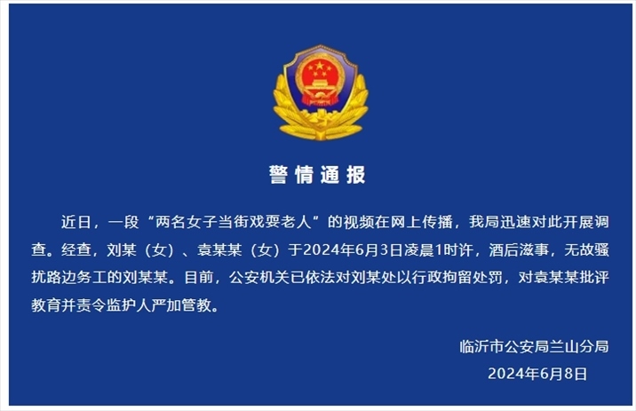 央視網(wǎng)消息:6月8日,臨沂蘭山公安發(fā)布警情通報(bào):近日,一段“兩名女子當(dāng)街戲耍老人”的視頻在網(wǎng)上傳播,我局迅速對(duì)此開展調(diào)查。經(jīng)查,劉某(女)、袁某某(女)于2024年6月3日凌晨1時(shí)許,酒后滋事,無故騷擾路邊務(wù)工的劉某某。目前,公安機(jī)關(guān)已依法對(duì)劉某處以行政拘留處罰,對(duì)袁某某批評(píng)教育并責(zé)令監(jiān)護(hù)人嚴(yán)加管教。