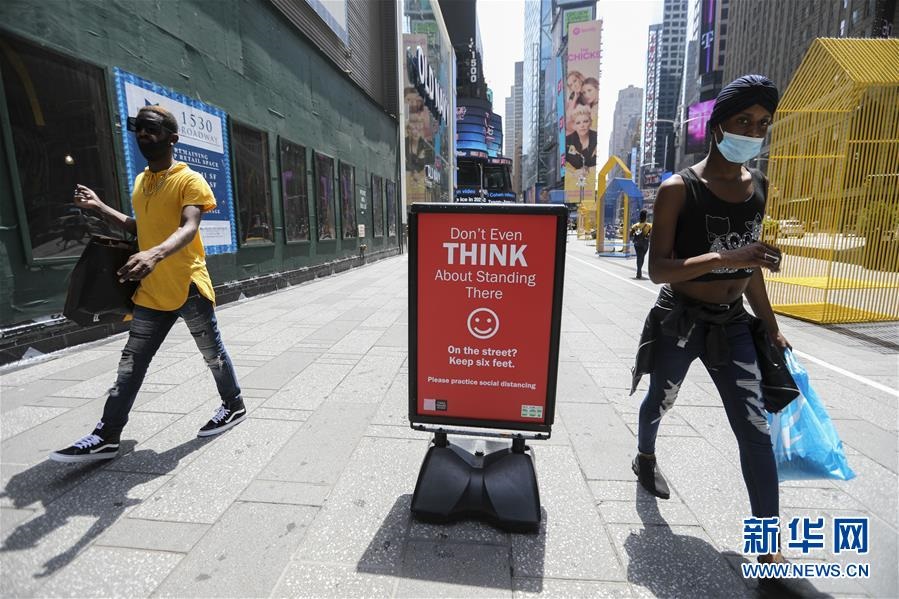 7月23日,在美國紐約時(shí)報(bào)廣場,人們從保持社交距離的提示牌旁走過。美國約翰斯·霍普金斯大學(xué)23日發(fā)布的新冠疫情最新統(tǒng)計(jì)數(shù)據(jù)顯示,美國累計(jì)確診病例超過400萬例。數(shù)據(jù)顯示,截至美國東部時(shí)間23日15時(shí)34分(北京時(shí)間24日3時(shí)34分),美國累計(jì)確診病例4007859例,累計(jì)死亡病例143846例。新華社記者王迎攝