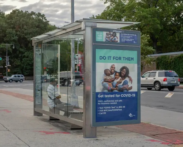 △美國(guó)紐約布魯克林一個(gè)公交車站的免費(fèi)核酸檢測(cè)廣告 (圖片來(lái)源:《紐約時(shí)報(bào)》)