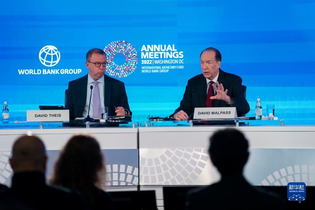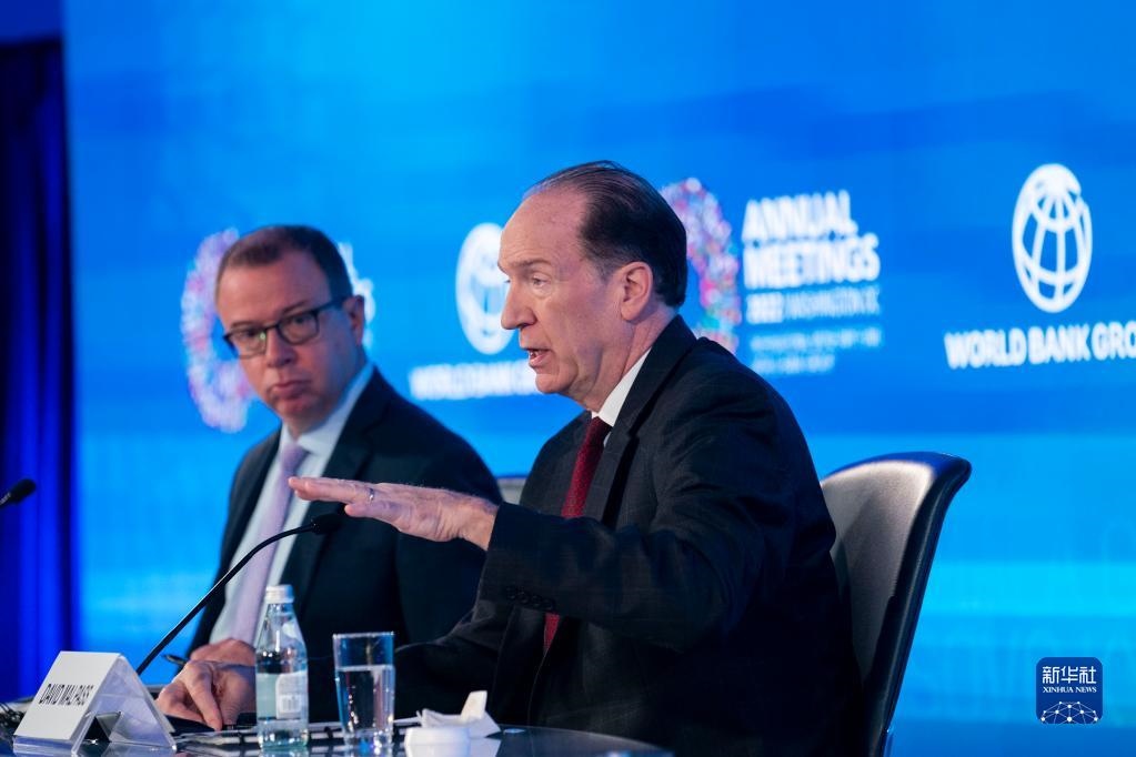 10月13日,在美國首都華盛頓,世界銀行行長馬爾帕斯(右)在記者會上發(fā)言。新華社記者 劉杰 攝