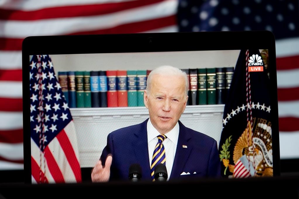 2022年3月8日拍攝的視頻畫面顯示,美國總統(tǒng)拜登在華盛頓白宮發(fā)表講話。拜登當(dāng)天宣布,美國將對(duì)俄實(shí)施能源禁運(yùn),停止從俄進(jìn)口石油、天然氣和煤炭。新華社記者劉杰攝