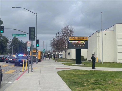 2月21日,美國(guó)加利福尼亞州洛杉磯縣,當(dāng)?shù)鼐浇拥綀?bào)警電話后一度封鎖了阿卡迪亞高中出入口。新華社記者高山攝