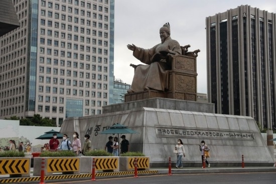2021年7月8日,行人佩戴口罩走在韓國(guó)首爾光化門(mén)廣場(chǎng)上。(新華社記者王婧嬙攝)