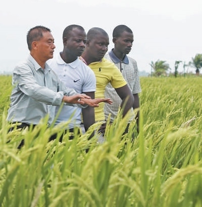 2022年10月29日,中國水稻專家但松柏(左一)在布隆迪布班扎省基航加縣指導當?shù)剞r(nóng)民種植水稻。董江輝攝(新華社發(fā))