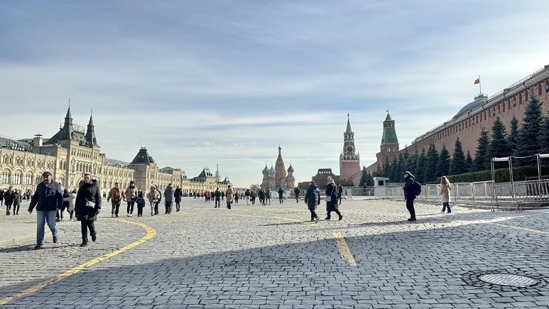 莫斯科紅場(chǎng)上,藍(lán)天白云,很多市民趁著好天氣外出游玩。